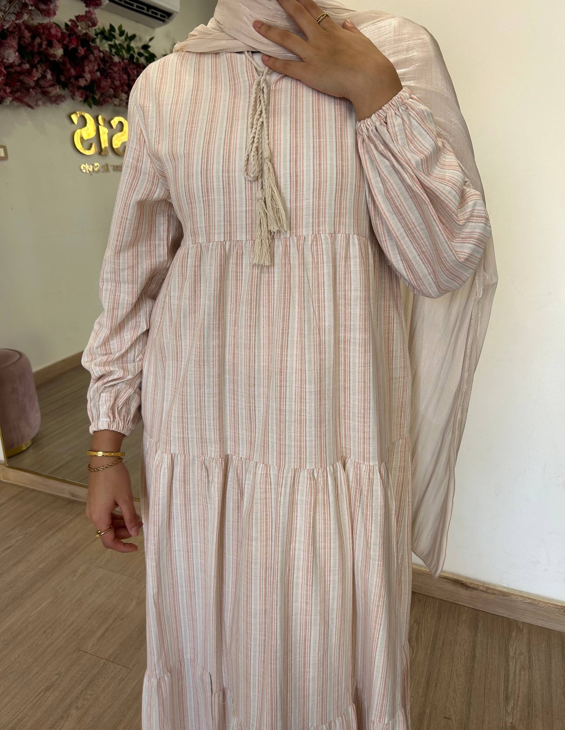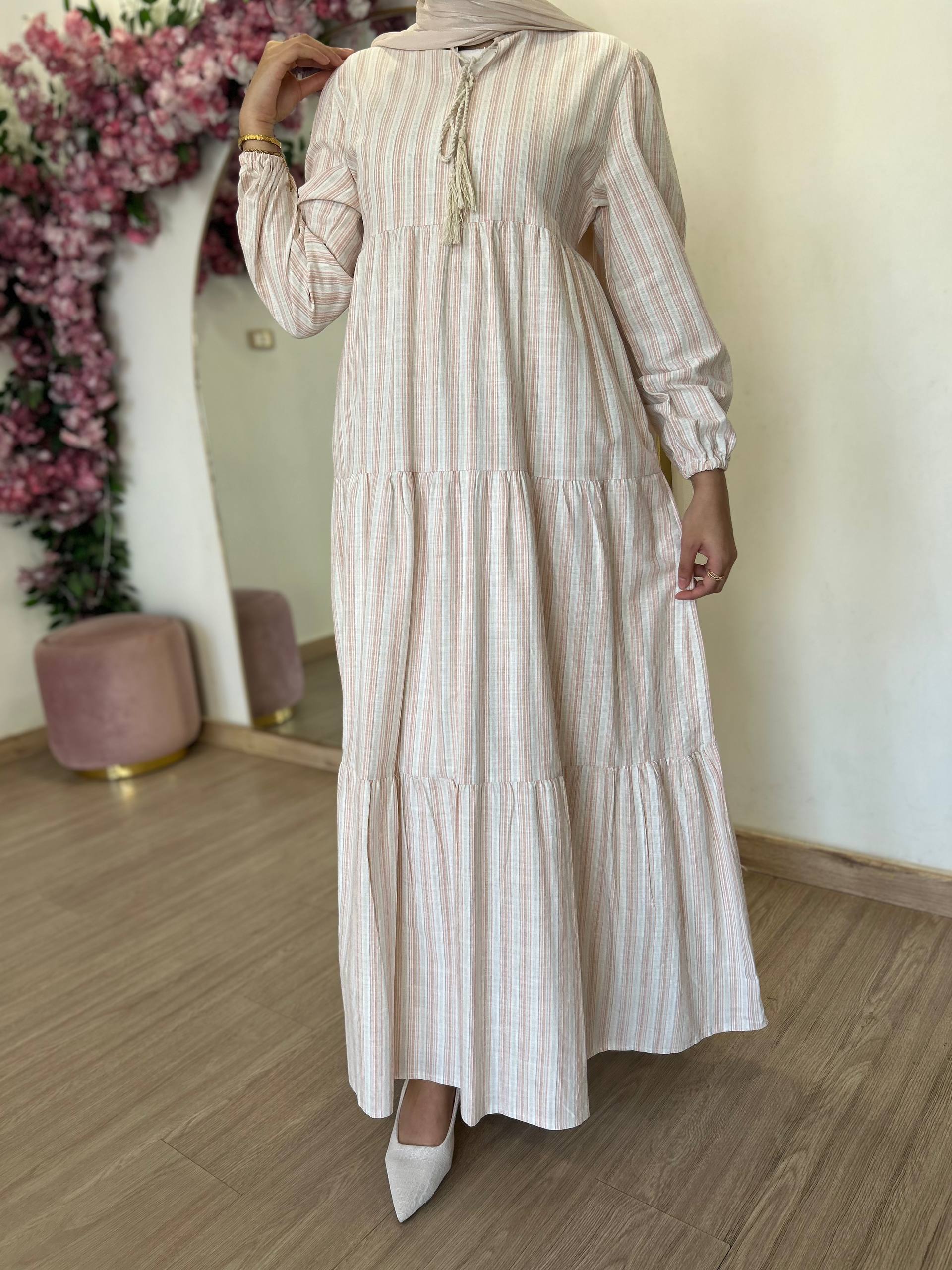 A maxi striped beige, pink and white dress