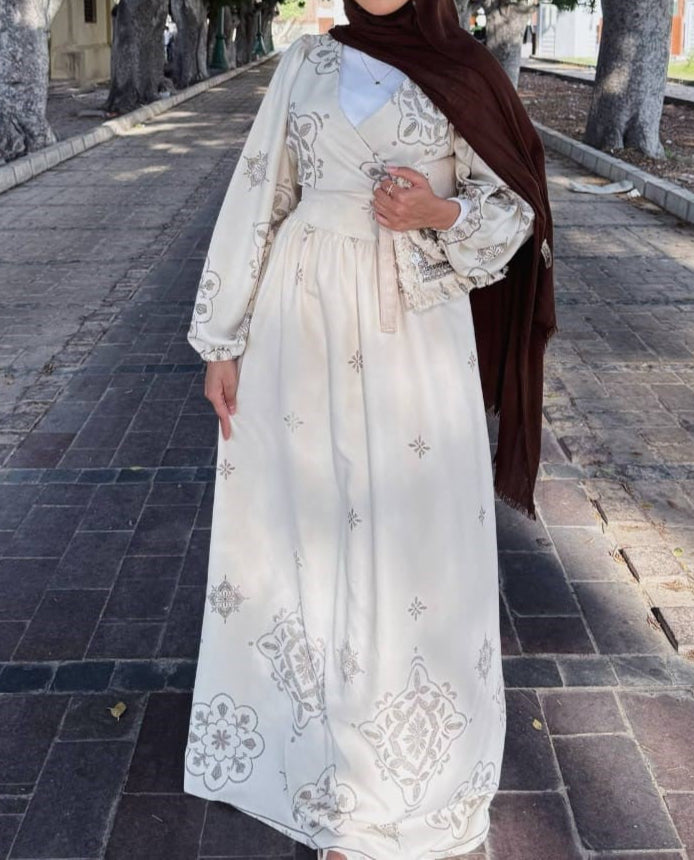 cream-colored maxi dress, empire waist, long puffed sleeves with gathered cuffs, loose, and flowing