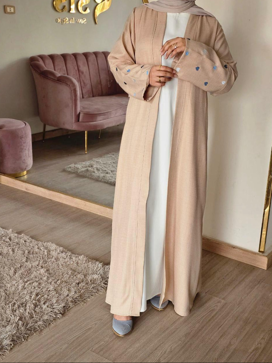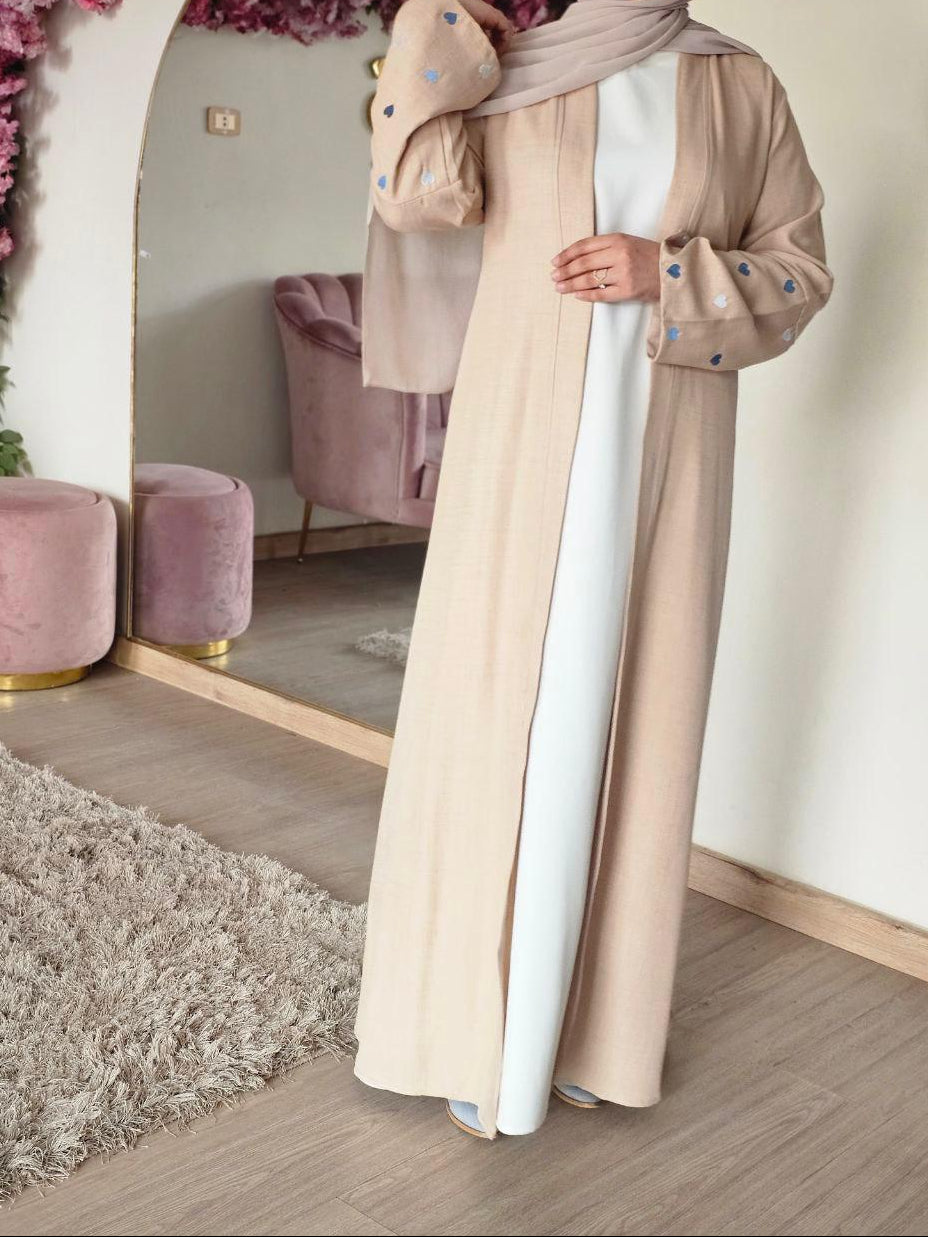 One-piece beige abaya made from Spanish linen. Features delicately embroidered heart details on the sleeves. Lightweight, elegant, and comfortable. Basic inner dress not included.
